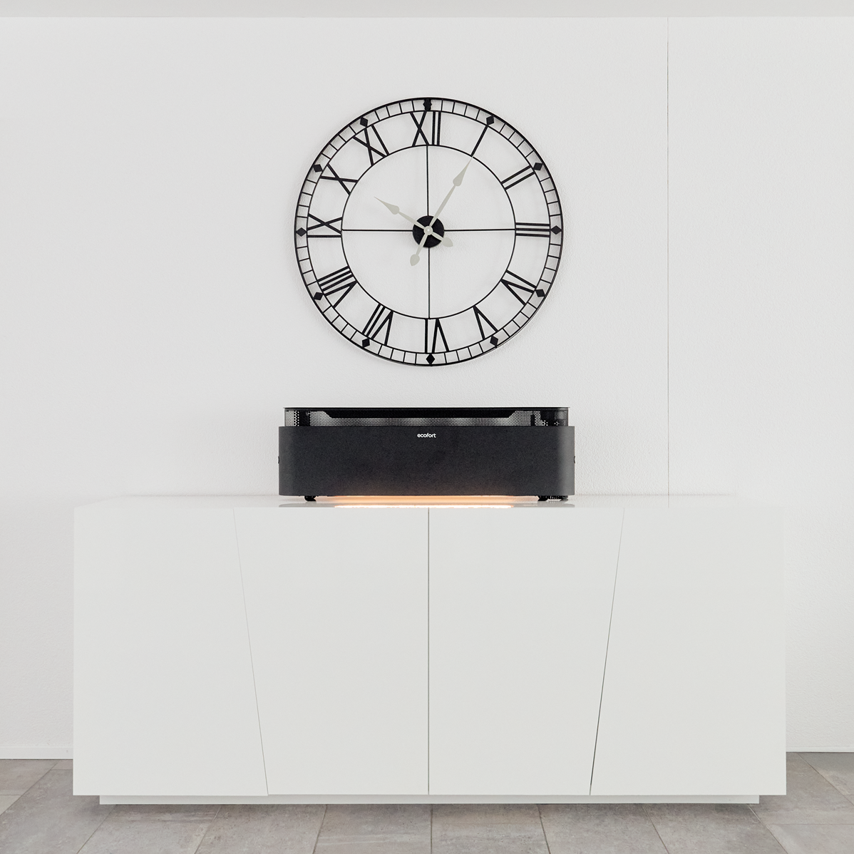 Der ecoQ HeatUp Monolith 2200 ist eine schlanke Design-Heizung für Wohn und Arbeitsräume. Ein Axialventilator verteilt die Wärme rasch und sehr leise. Stahlblech statt Plastik und ein Aluminium Heizelement stehen für langlebige Qualität. Der Lift Up Auslassdeckel öffnet beim Einschalten und schliesst im Standby, hält Staub vom Heizelement fern und verhindert Gerüche sowie Verfärbungen. Das Ambient-Light setzt dezente Akzente und lässt sich bei Bedarf vollständig deaktivieren.