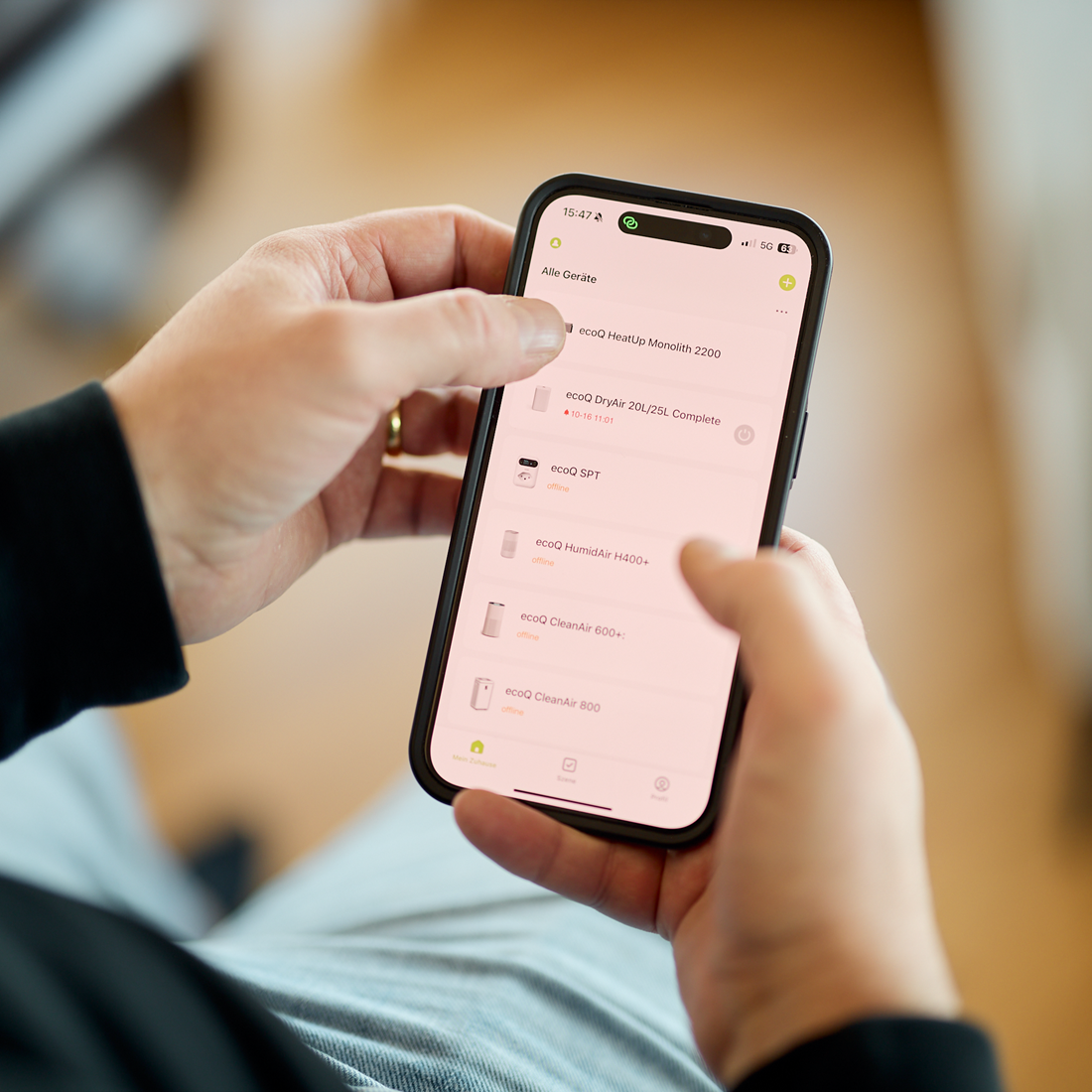 Mit der ecofort SMART App (2.4 GHz Wi-Fi, Bluetooth aktiviert) lässt sich der Monolith vollständig steuern. Im Standby-Modus die POWER-Taste 3 Sekunden gedrückt halten, bis das Wi-Fi-Symbol blinkt, dann das Gerät in der App koppeln.