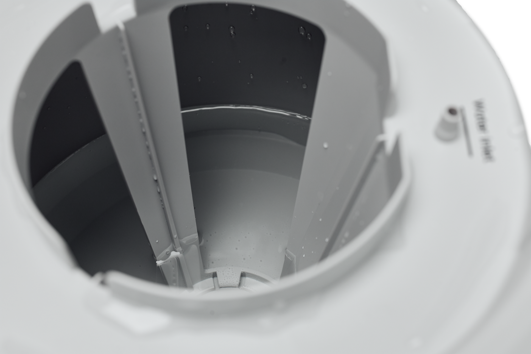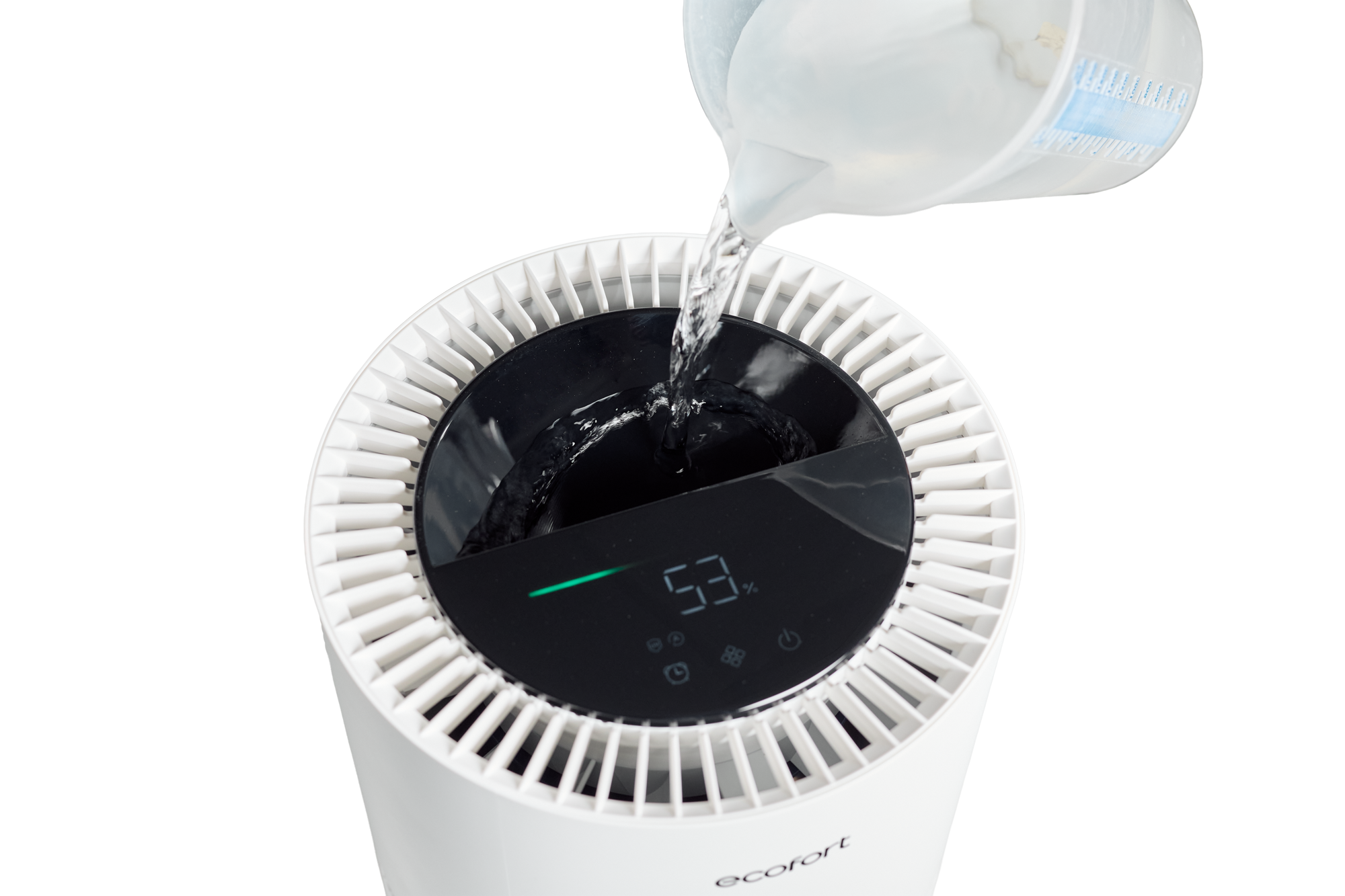 Der 8-Liter-Tank (6.8 l nutzbar) wird komfortabel von oben befüllt (Top-Filling-System). Eine digitale Anzeige zeigt Wasserstand und Raumfeuchtigkeit deutlich an: