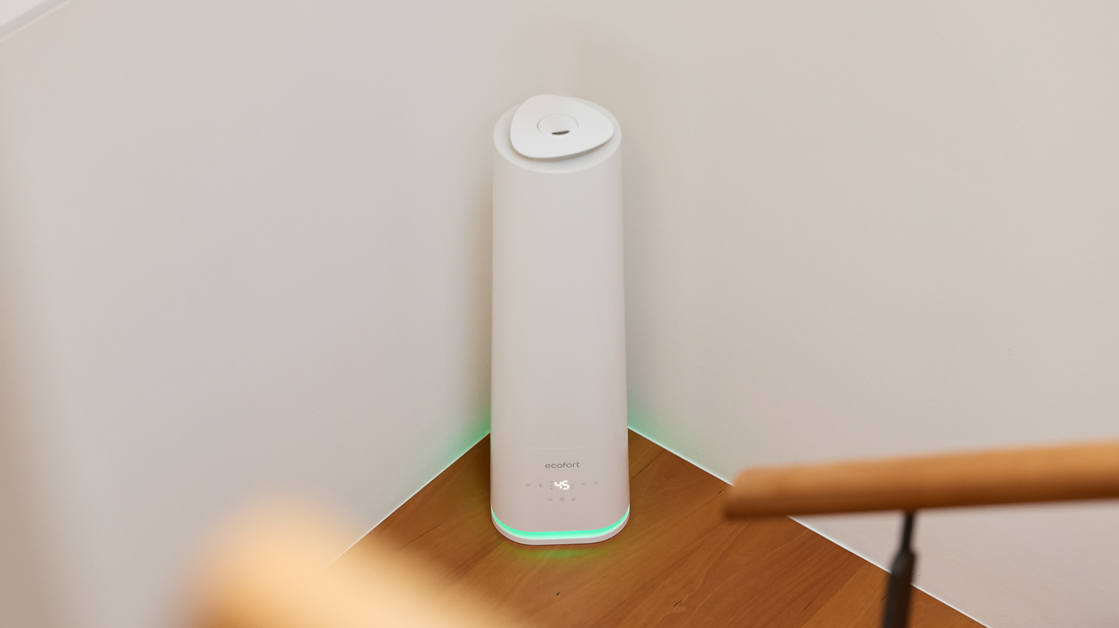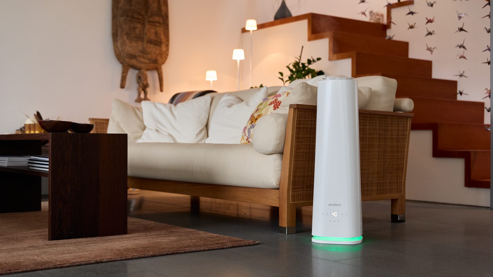 Für Hygiene und Komfort sorgen UV-Licht und zuschaltbarer Warmnebel, damit das Wasser vor der Vernebelung behandelt wird und der Nebel angenehm temperiert ist. Gesteuert wird der U500 über das Touch-Bedienfeld, die ecofort SMART App (Wi-Fi) oder die magnetische Fernbedienung. Die Humilight-Anzeige zeigt den Feuchtestatus in Rot, Grün oder Blau. Zusätzlich bietet der U500 ein integriertes Ambient-Light mit sieben Farben, per App wählbar oder mit automatischem Farbwechsel. Ein Aromafach ermöglicht bei Bedarf die Nutzung ätherischer Öle für ein spürbar angenehmes Raumklima im Alltag.